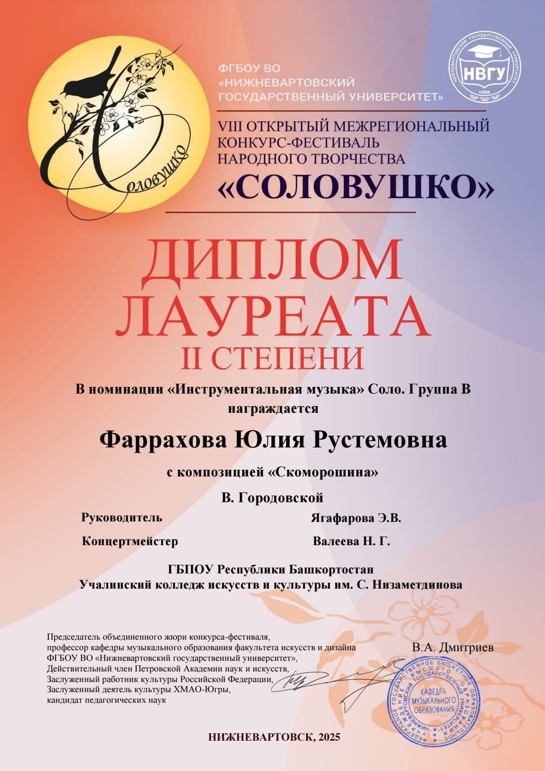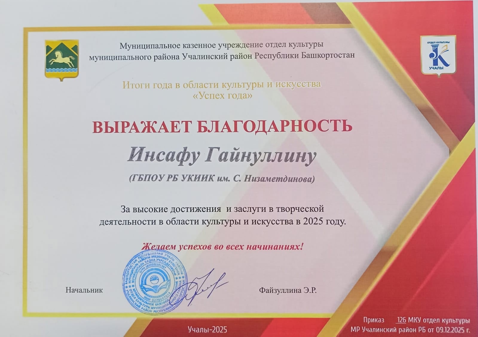 В Уфимском государственном институте искусств им. З. Исмагилова 4-5 декабря прошел Шестой Международный конкурс исполнителей на традиционных музыкальных инструментах «Урал иле».Отделение «Национальные инструменты народов России » Учалинского колледжа искусств и культуры им. С. Низаметдинова приняли участие в конкурсе и были удостоены следующих наград: