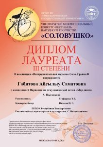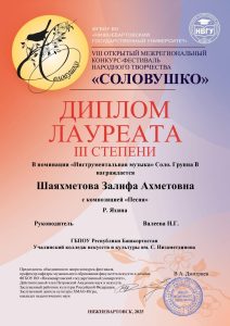 Наша студентка Шаяхметова Залифа, преподаватель Валеева Наиля Гатаулловна. стала обладателем диплома лауреатом 1 степени.