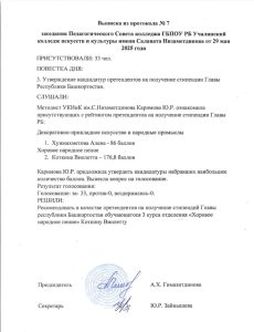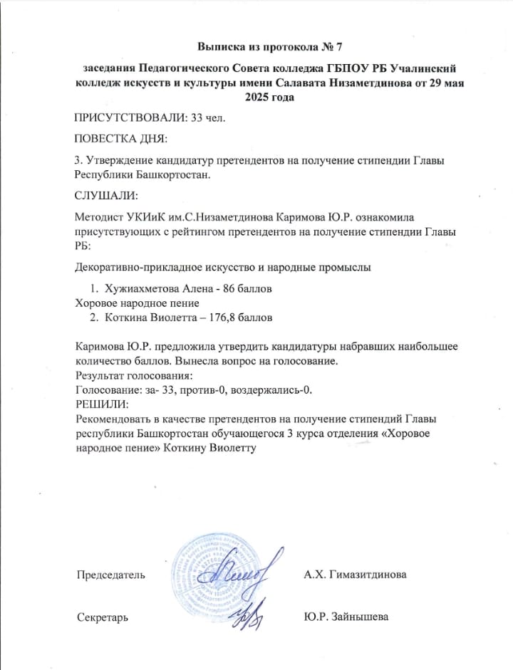 По результатам конкурсного отбора Решением Педагогического совета от 27.06.2025 г. на соискание стипендии Главы Башкортостан утверждена кандидатура студентки 3 курса специальности 53.02.05 ХНП Коткина Виолетта